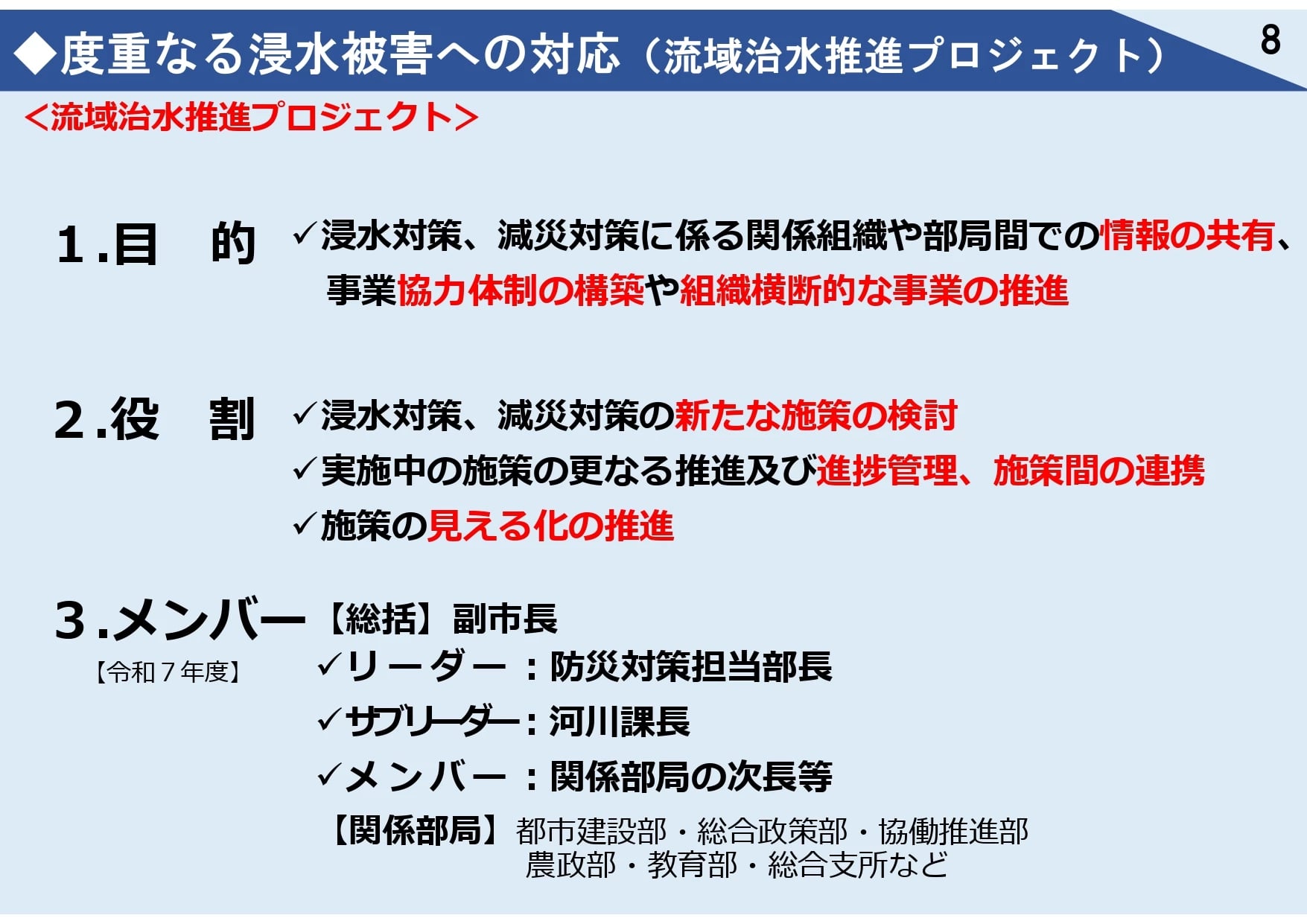 この課題に対応するため、現市長の就任直後である令和4年2月に「流域治水推進プロジェクト」を設置しました。これまで河川部局や防災部局が中心となっていた対策を、総合政策部や農政部なども含めた組織横断的な体制に拡大し、浸水対策・減災対策を推進しています。
