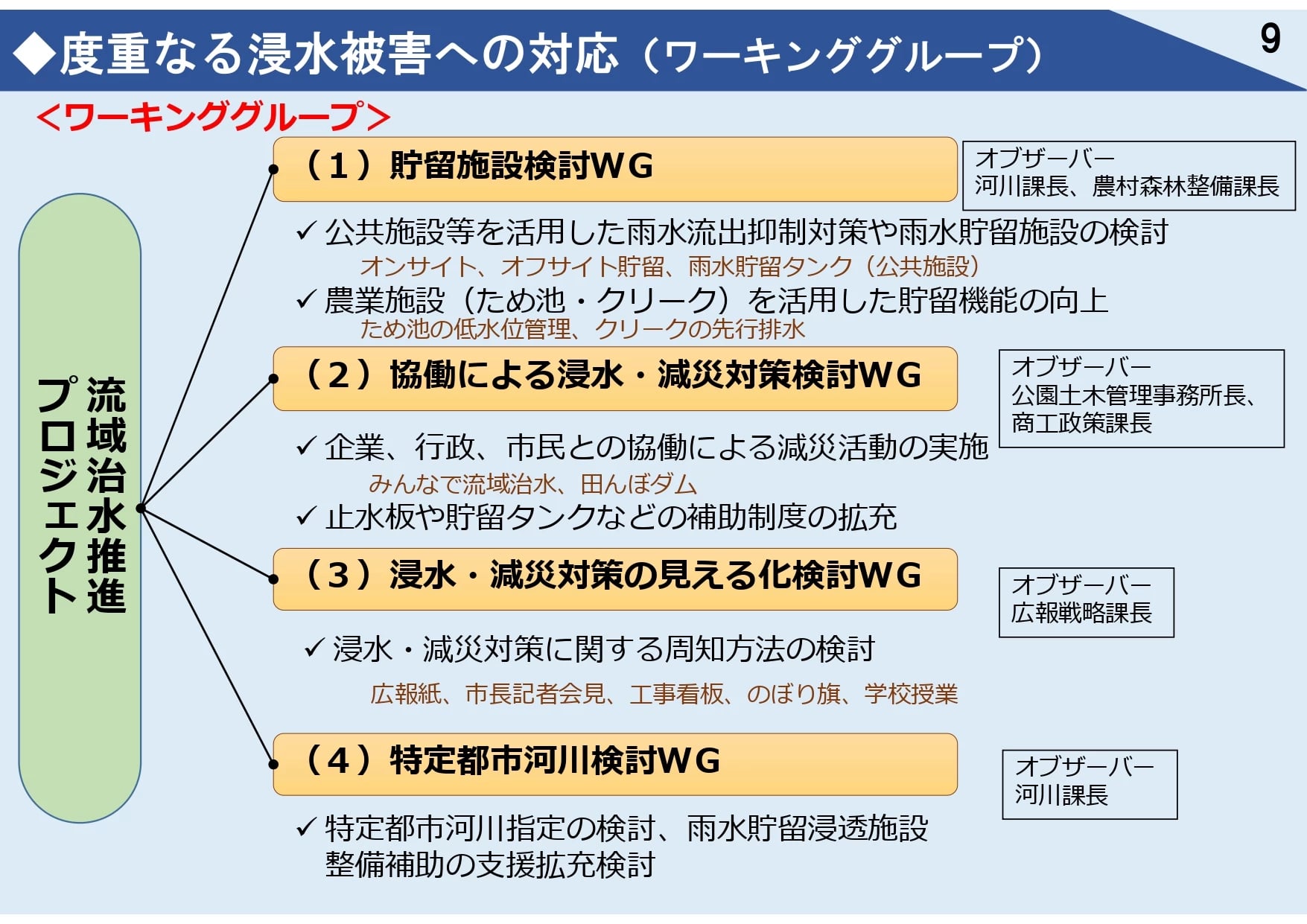 さらに具体的な検討を進めるために、4つのワーキンググループを設置しています。1つ目は貯留施設の検討で、公共施設を活用した雨水の流出抑制や貯留施設の整備、農業施設の活用などを検討しています。2つ目は協働による浸水・減災対策で、企業や行政、市民と連携したボランティア活動や、田んぼダム、貯留タンク設置への補助制度の拡充などを検討しています。3つ目は見える化で、広報や記者会見などを通じた周知方法の検討です。4つ目は特定都市河川の検討で、浸水被害の著しい河川に対する新たな対策として、特定都市河川の指定について検討しています。これらの内容はプロジェクト会議で報告され、市長も参加する中で迅速な意思決定が行われています。