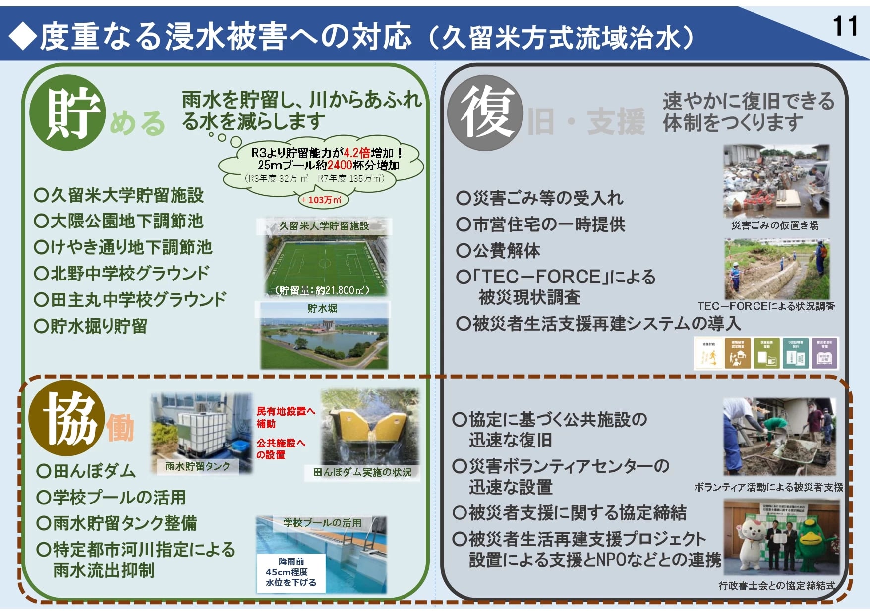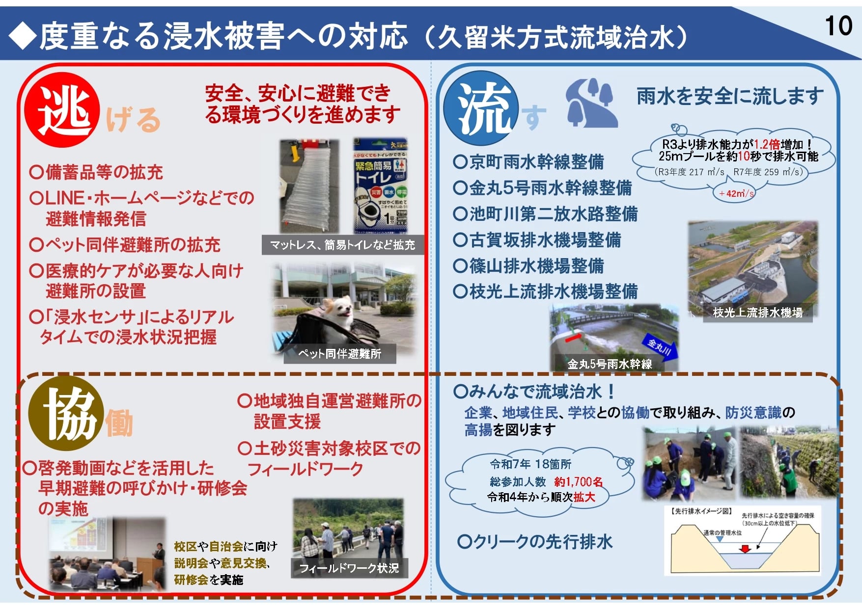 このように久留米方式流域治水は、単なる技術的対策ではなく、ハード整備、ソフト対策、そして地域の協働を一体的に進める取り組みです。特に重要なのは、市民一人ひとりに流域治水を自分ごととして捉えてもらうことであり、市長自ら地域と対話を重ねています。今後も久留米市としては、関係者と連携しながら、流域全体で水害に強いまちづくりを着実に進めていきたいと考えています。