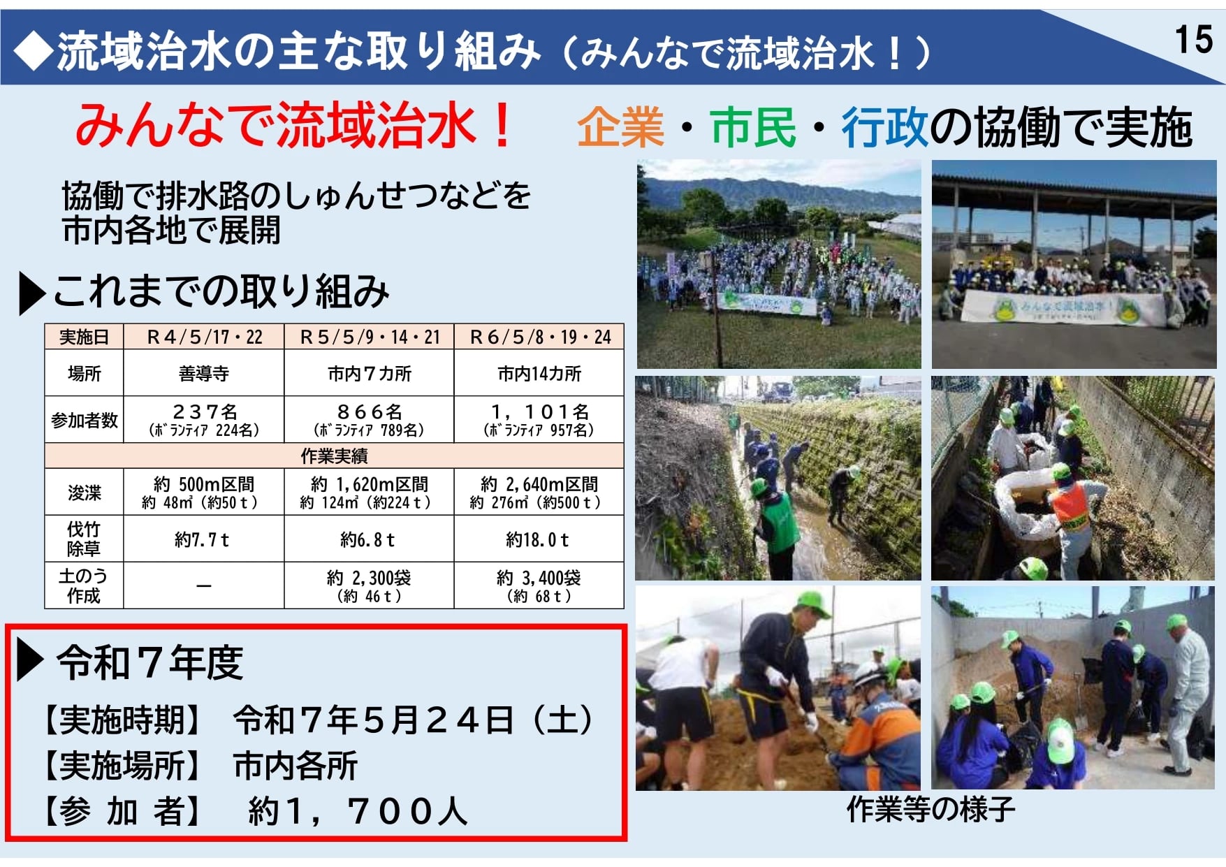 さらに特徴的なのが「みんなで流域治水」の取り組みです。市民、企業、行政が協働し、排水路の清掃や土のうづくりなどを行うもので、令和4年度は約200人規模でしたが、令和7年度には約1700人規模まで拡大しました。この活動を通じて、「自分たちのまちは自分たちで守る」という意識が広がっています。