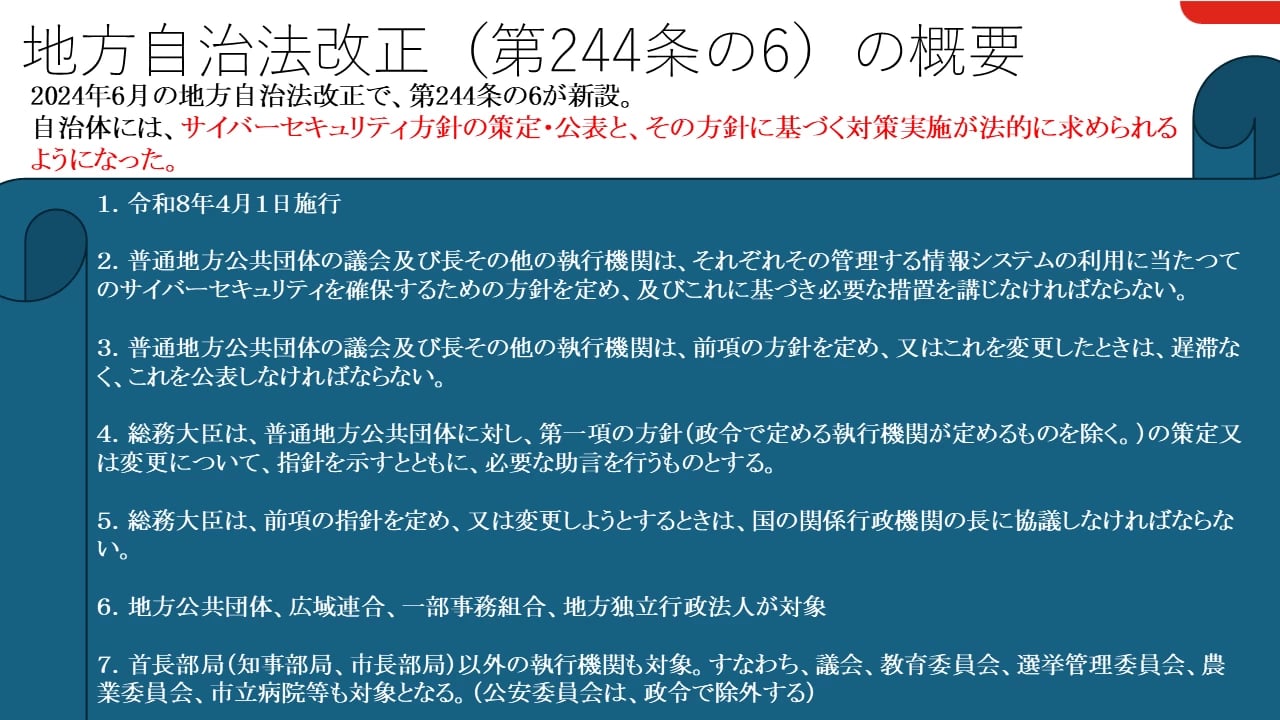 髙橋:今回の改正は令和6年の通常国会で採択され、令和8年4月に施行されました。まず、注目してほしいのは「サイバーセキュリティを確保するための方針を定め、及びこれに基づき必要な措置を講じなければならない」と義務化されたこと。そして令和8年4月1日から(案)が取れて、大臣指針となることです。議会事務局や一部事務組合なども含む全ての地方公共団体が「セキュリティポリシー」策定を義務付けられました。