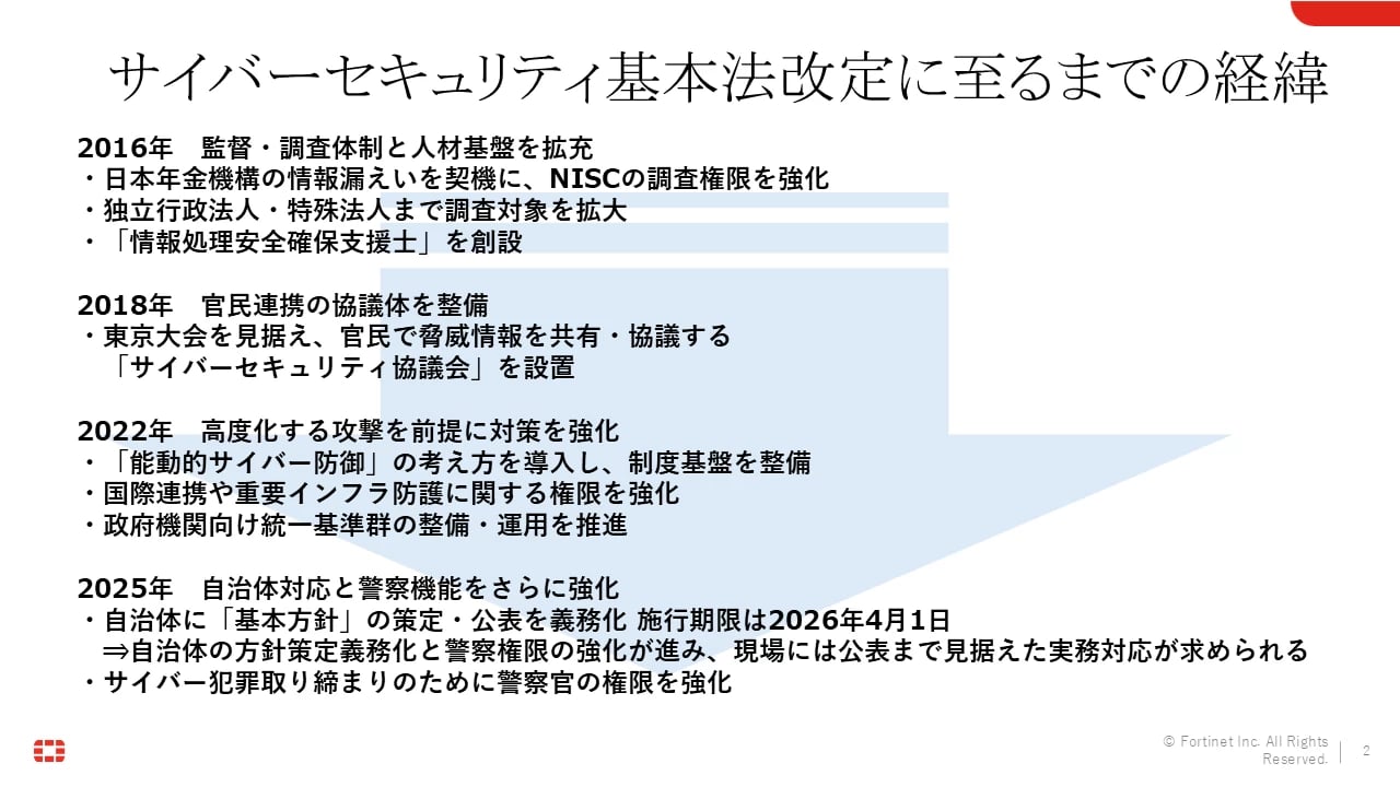 伊藤:次に「サイバーセキュリティ基本法」の改正についてお伺いしたいと思います。もう一段上の、国家レベルのセキュリティ対策になりますが、国全体の安全保障の枠組みの中で、地方公共団体も一段意識を上げてセキュリティ対策に取り組んでいかないといけないと理解するべきでしょうか。