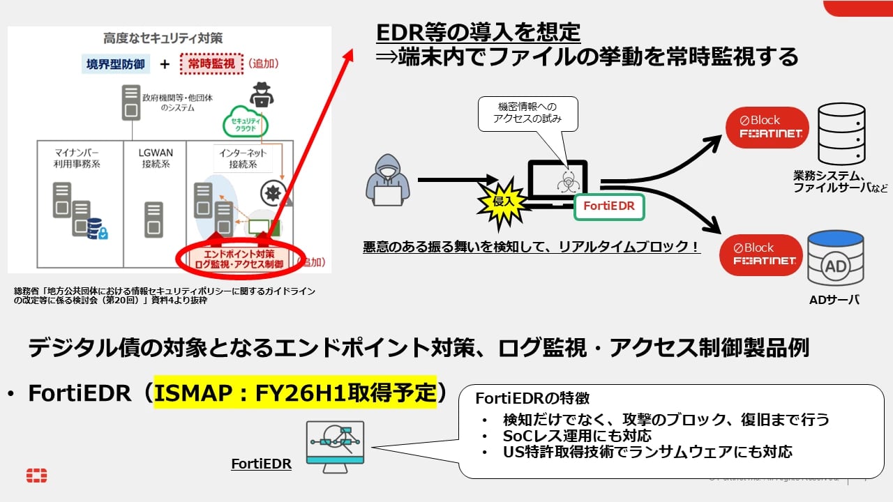 伊藤:おっしゃる通りで、我々も教育委員会の「ゼロトラスト」化や自治体の「α’モデル」への対応で多数のお客様に採用されていますが、ネットワークセキュリティ製品だけでなく、「FortiEDR」の引き合いも増えています。