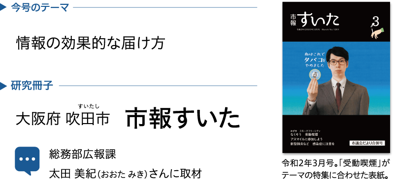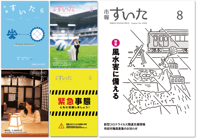 平成30年に全面リニューアルを行った「市報すいた」。広報媒体もペーパーレス化やデジタル化が進んでいるが、「通信環境などが原因で情報にたどり着けない市民のために、紙媒体の役割も大事にしたい」という思いから、それまで一部カラーだった誌面をフルカラーに。〝若年層にも手に取ってもらえるデザインと分かりやすさ〞をコンセプトにリニューアルを進めたという。