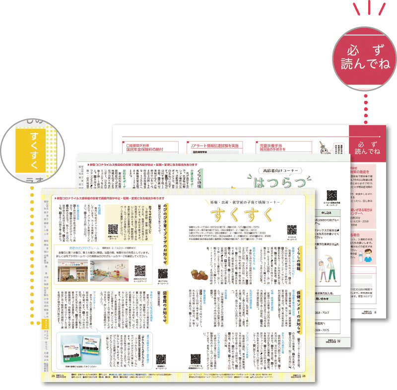 豊富な情報量も特徴的で、それゆえ〝欲しい情報を見つけやすくすること〞にもこだわりが感じられる。例えば、ページ端に子育てや健康といったジャンル別インデックスを設け、さらにジャンルごとに色を変えて分かりやすく。情報ページを開いてみると、確かに情報がぎっしり詰まっているのに読みづらさがなく、何のページなのかパッと認識できる。さらに、二次元コードをページ内に配置することで、読者が詳しい情報をキャッチできる点も気が利いている。