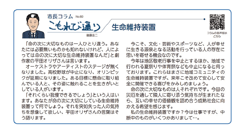 市長自ら、日々の仕事や暮らしの中で感じたことをつづった、親しみやすさと知性を感じる人気のコラム。
