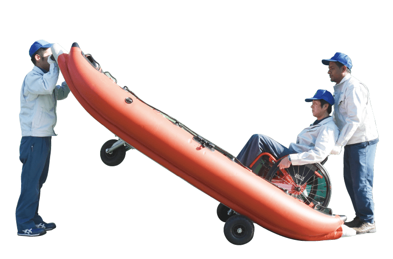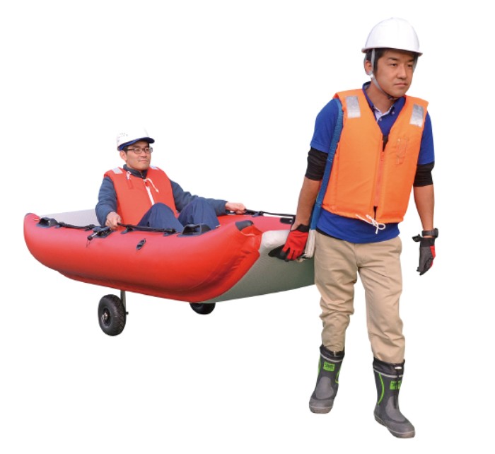 さらに、底面にはノーパンクの車輪が取り付け可能で、陸地に上がった時の移動も楽だ。これは製品開発の際に「セーフティボートが水を脱出した後は“大きくて重い担架”になってしまう」という消防の現場から届いた声を反映させたのだという。