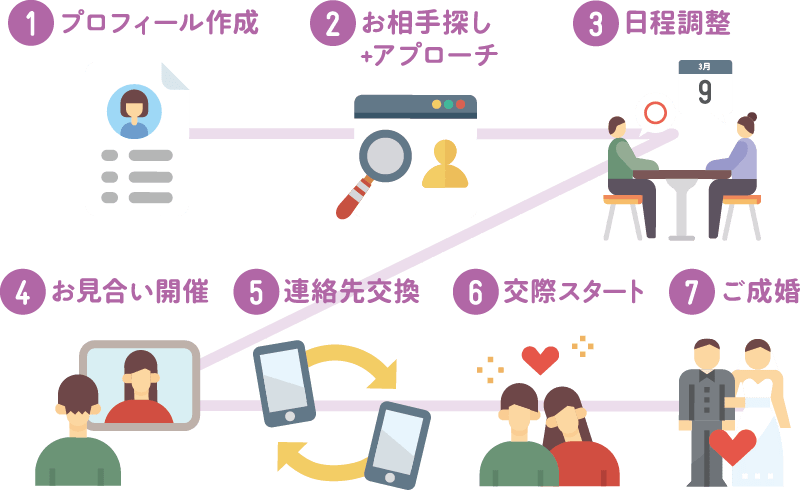 年齢・趣味・結婚観・写真などを掲載するプロフィールを作成。自己PRの書き方は仲人がアドバイス。“独身” “学歴” “収入(男性のみ)”の提出が必須だから安心。