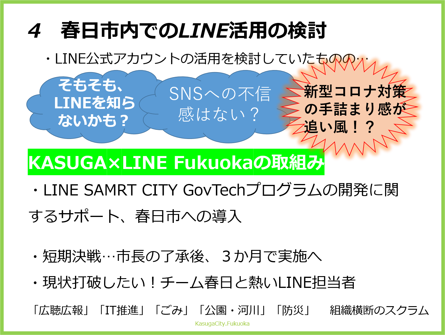 LINE Fukuokaは、2018年度から福岡市とLINE公式アカウントを活⽤した様々な取り組みを推進してい る。春⽇市もLINE公式アカウントの活⽤を検討しており、デジタル化推進に向けての下地はできていた。 とはいえ、まずは庁内の合意形成をしなければならない。
