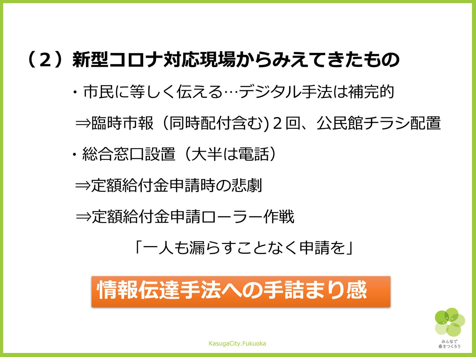 「春日市では、電話対応を中心とした総合窓口を設置し、土日も含めて稼動しました。『マスクが手に入らない』『給付金のことを詳しく知りたい』『会社の経営が立ち行かない』など問い合わせ内容は様々で、住民の方々の不安が伝わってきましたが、窓口のキャパシティにも限界があります。迅速に解決すべき課題があると感じました」。