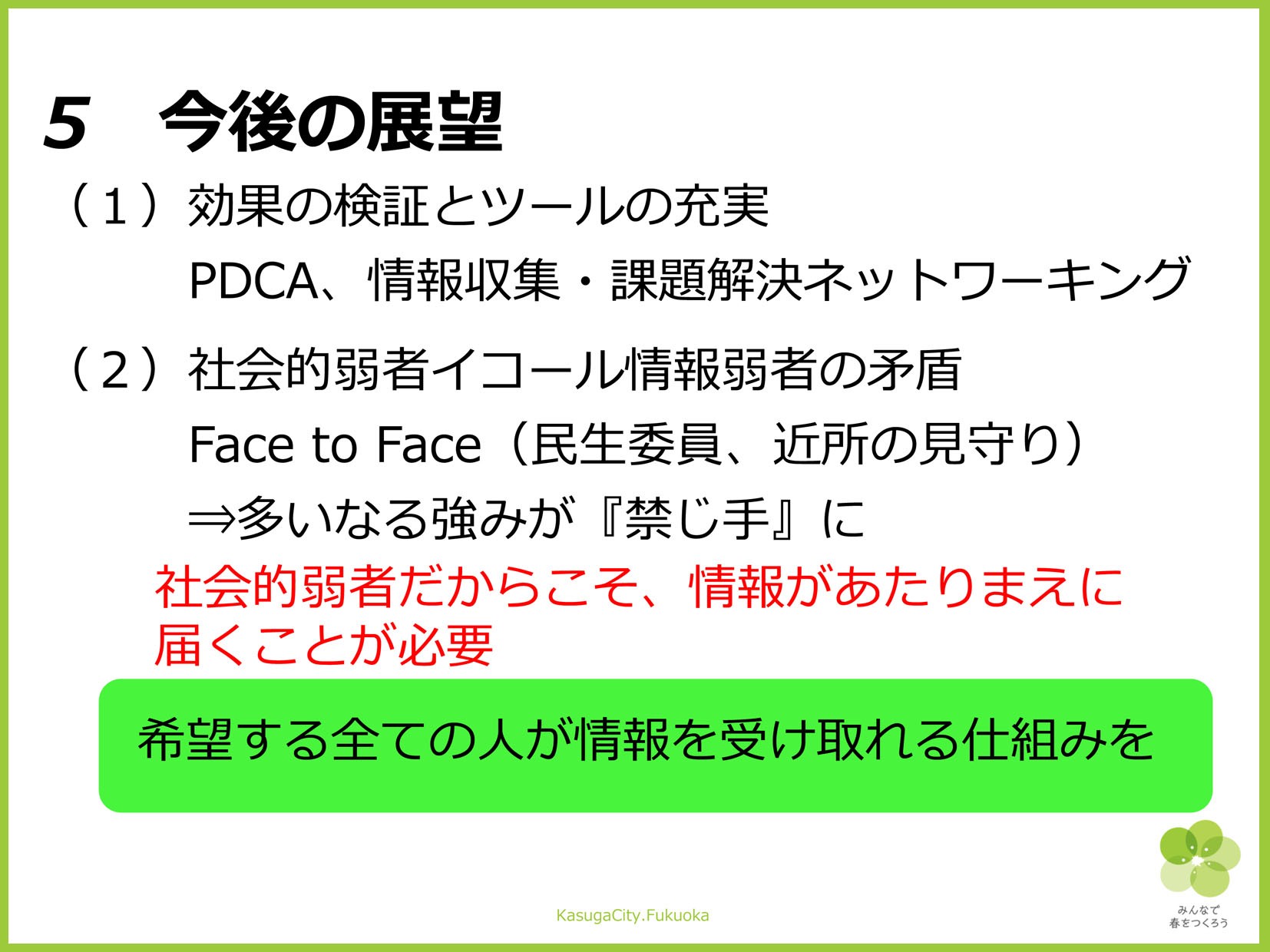 また、情報弱者のことも忘れてはいけない。神崎さんは、今まで民生委員や地域の見守りなどで保たれていた「人対人」の絆がコロナ禍では禁じ手となったことに触れ、「社会的弱者に情報が届きにくいという大きな矛盾を解消するために、春日市LINE公式アカウントも含めて、希望する全ての人が情報を受け取れる仕組みを考えていきたい」と結んでくれた。