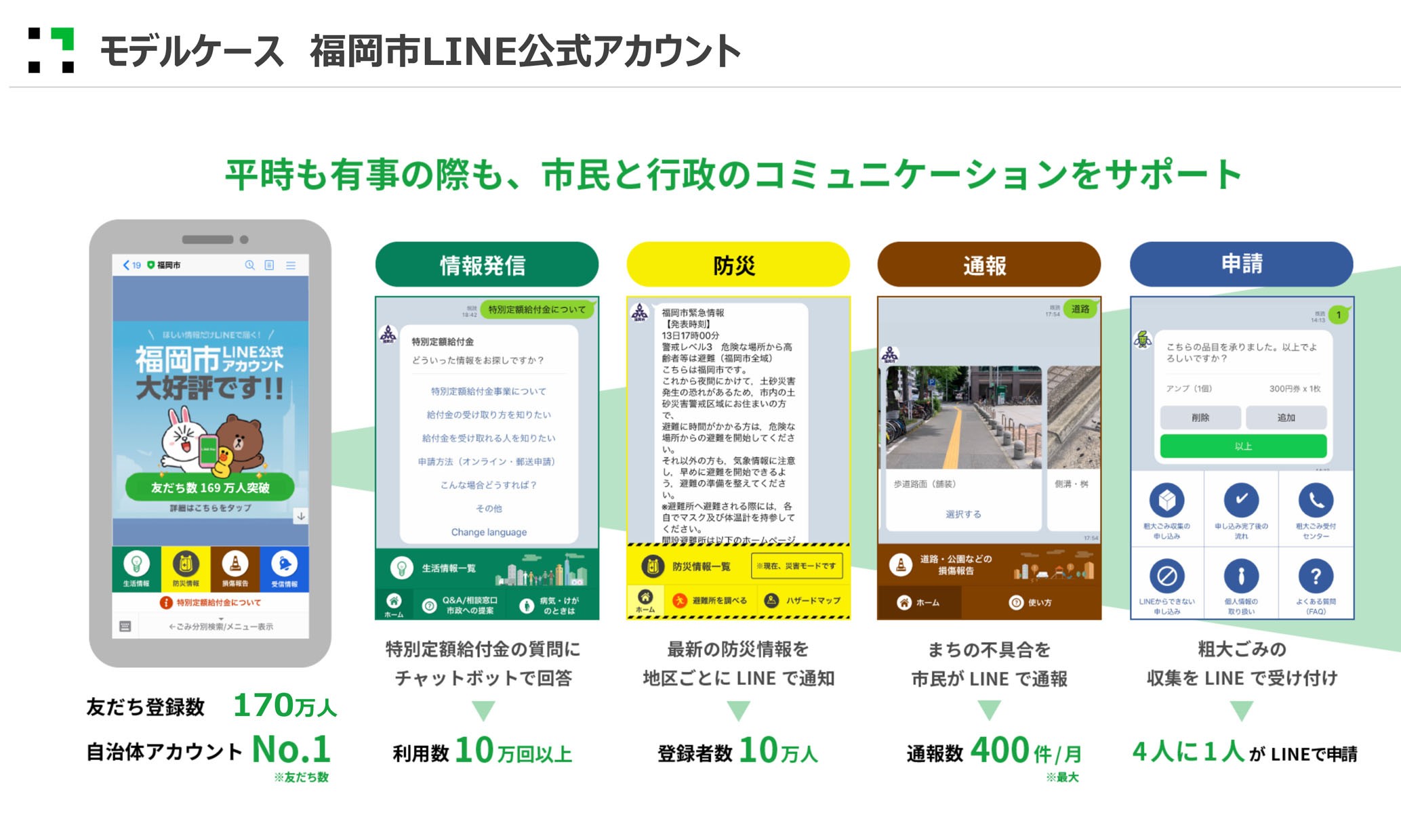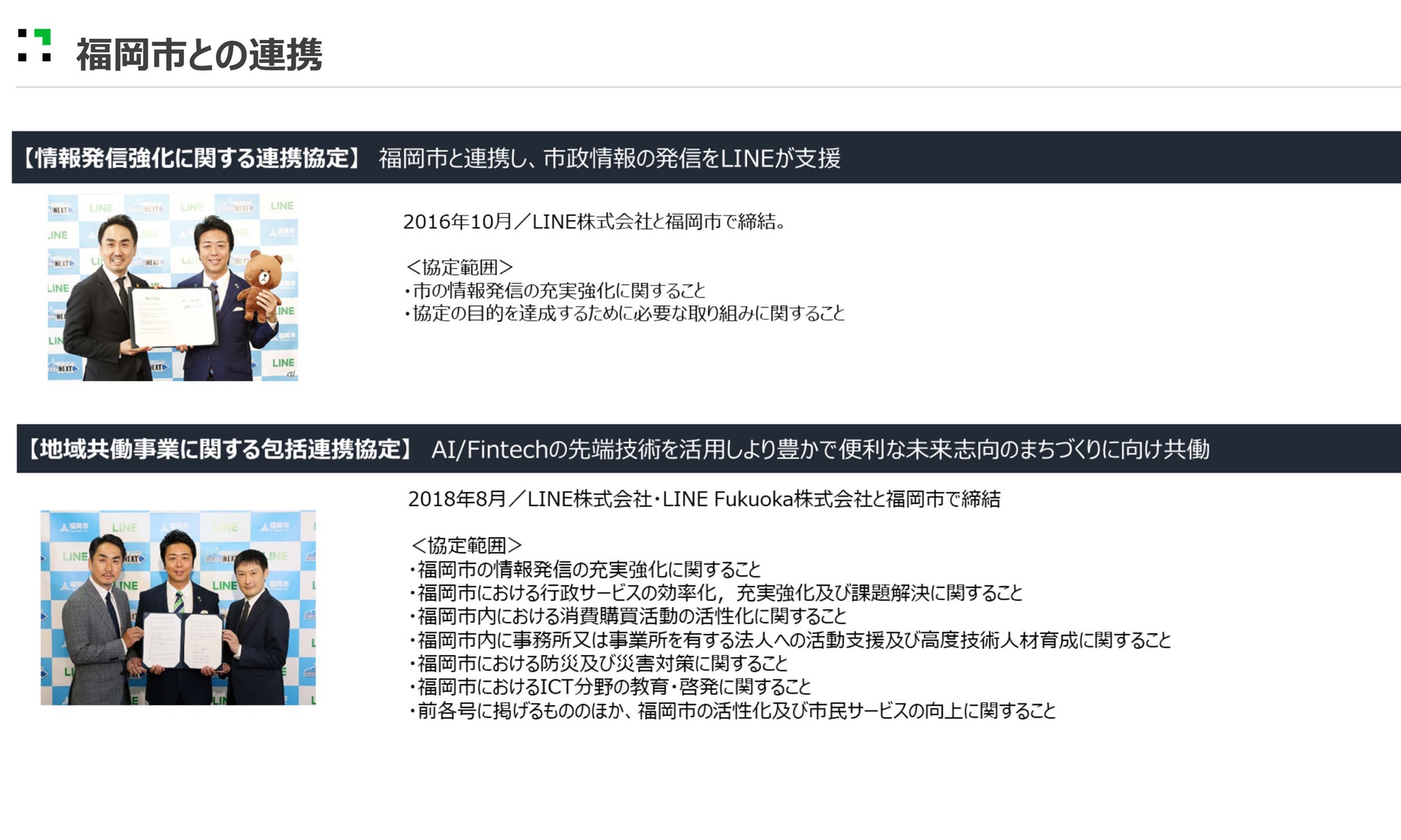 福岡市とLINE、LINE Fukuokaの3者は、AIやFintechなどの先端技術を活⽤し、より豊かで便利な未来志向のまちづくりに向け共働して取り組むため、平成30年8⽉に包括連携協定を締結。LINE Fukuokaは社内に「Smart City戦略室」を⽴ち上げた。 ⽬的は、「LINEを活⽤して⾏政と市⺠の距離を縮め、コミュニケーションの活性化する」というコンセプトを基に、全国の⾃治体のモデルケースとなる事例を創出するためだ。