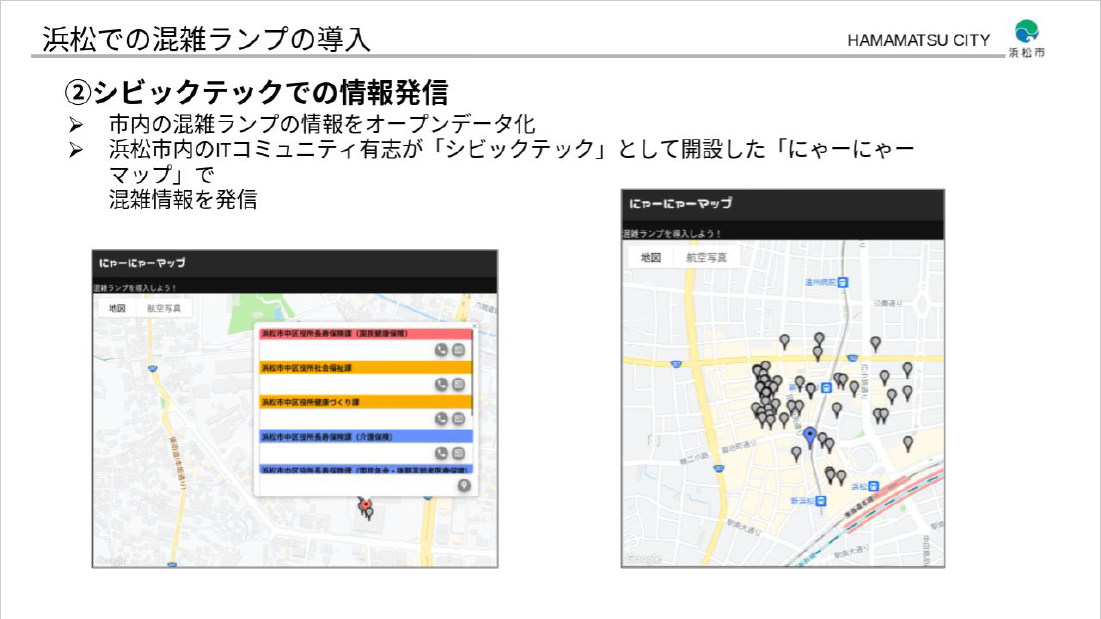また、混雑ランプはシビックテック(※)とも連携。混雑データをオープン化して、市内のITコミュニティ有志がそれを活用しWeb上の地図「にゃーにゃー(near,near)マップ」に落とし込んだのです。これによりさらに利便性が高まりました。