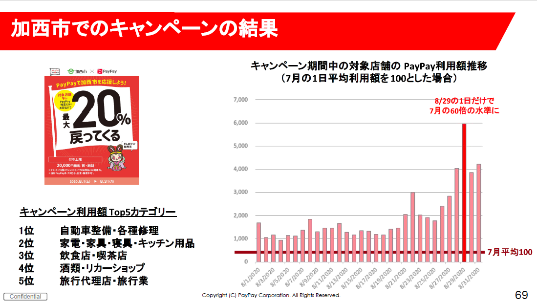 高橋:還元率は20%、上限2万円なので、PayPayで10万円使えば2万円戻ります。「ここまでやって大丈夫か」という不安はありました(笑)。しかし結果は十分。PayPayの利用率が前月比で1日あたり10倍から最大60倍にまで伸びたのです。9月に入っても高い利用率で推移しており、キャッシュレス決済が定着しつつあるのを感じます。