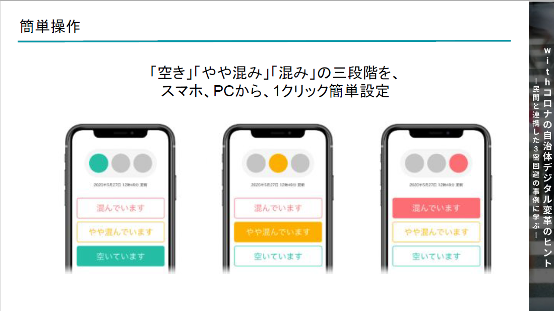 自治体の場合、住民利用が多い窓口などで導入、窓口状況に合わせて職員が設定をし、公式ホームページなどを通してリアルタイム発信すれば来庁者も安心。私たちはこれを「混雑のソーシャルインフラ」と位置付け行政に無償提供しています。