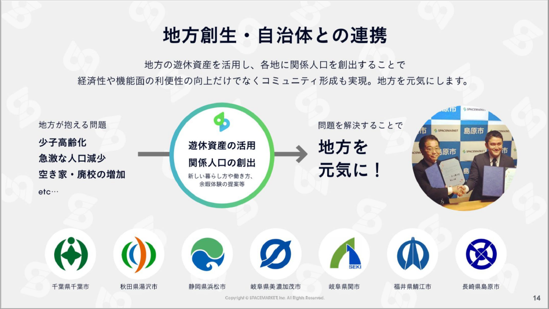自治体との連携も実施しており、浜松市からは2名の出向を受け入れています。また、シェアリングエコノミー協会では、知見を共有する「シェアサミット」などを実施しており、西村経済再生担当大臣やサントリーの新浪社長、各自治体首長など多くの方に登壇いただいています。