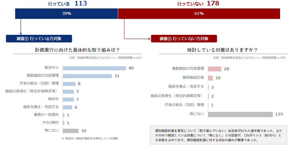 個別施設計画を策定について「取り組んでいない」自治体が61 %と過半数であった。またその中で検討している対策について「特になし」との回答が、 135 ポイント(約 76 %)と大多数を占めており、個別施設計画に対する対応の遅れが顕著であった。