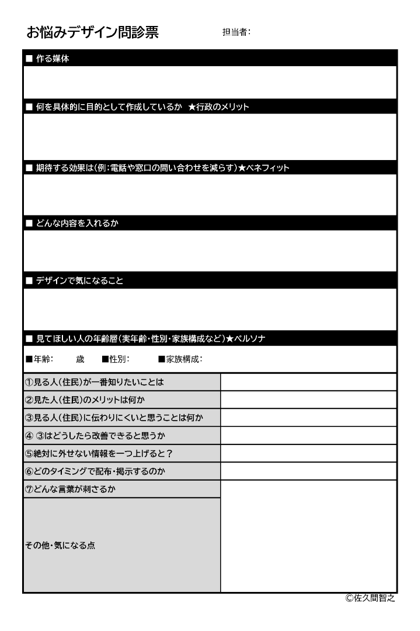 ゴールを設定したら、伝えたい情報が何かを考えます。ここで有効なのが「デザイン問診票」です。デザイン研修をするときや広報アドバイザーをしている自治体で実践しているもので、行政が伝えたいこと、住民が知りたいことを可視化させる方法です。
