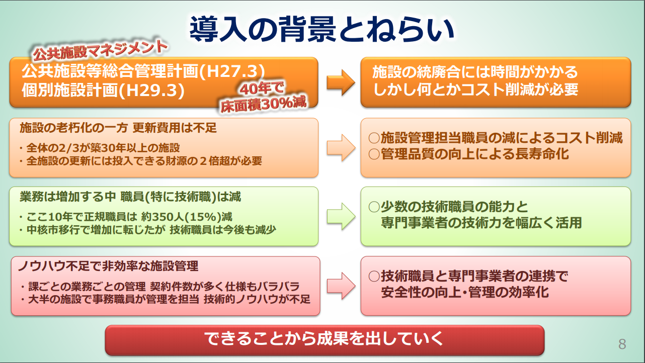 この制度を導入したきっかけは、やはりコスト削減。今後40年間で明石市が管理する施設の延べ床面積は30%減少すると予測されているが、施設の統廃合には地元住民などステークホルダーの合意も必要で時間はかかる。また、今ある施設を適切に管理運用していくことで、施設の長寿命化も図る必要がある。業務は増加する一方で、技術職の職員は減少していくため、少数の技術職員の能力を幅広く活用するために、施設管理のノウハウを豊富に持つ専門事業者との連携を選択したのである。