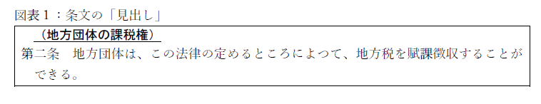 法律の条文には、その内容を簡潔に表現した「見出し」が付されています。見出しにより条文の内容を大まかに知ることができれば、本文を読む助けになります。図表1では、「(地方団体の課税権)」の部分が見出しです。