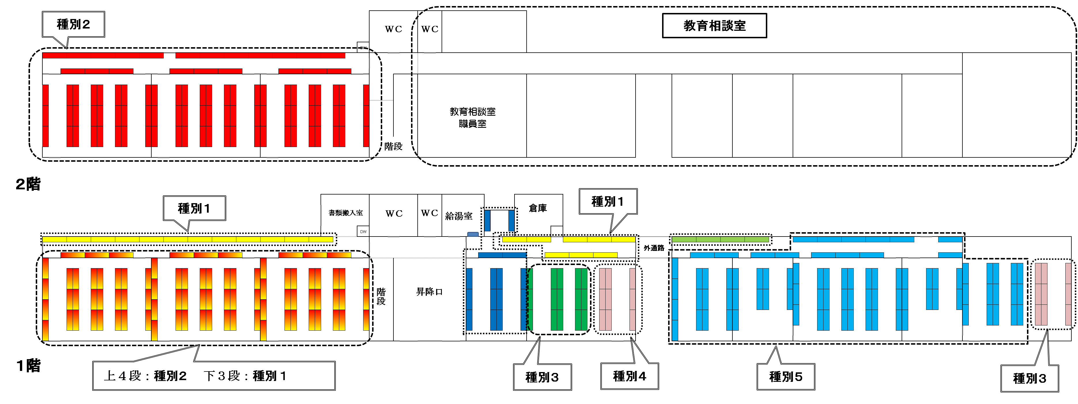 →遠回りかもしれないと思いつつ、すべての箱(約8,300箱)の把握を行い、管理番号を振った。作業工程別に、旧書庫と新書庫のそれぞれにおける棚と箱の設置状況図を作成し、入札前に概ね全行程の内容を想定することにした。