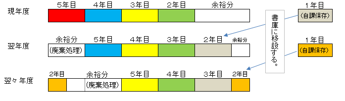 公文書書庫で4年間保管する(1年目(発生年度の翌年度)は、自課で保存する。)。
