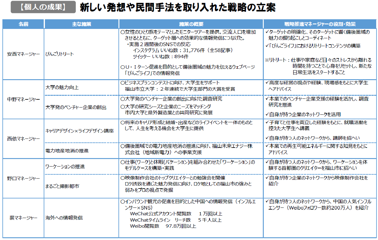 5人の戦略推進マネージャーは,約2年間の任期の中で,それぞれ本業で培った知識,経験,人や企業のネットワークを活かしながら,施策を立案し,実行に移した。このように,新しいアイデアからその実現までを戦略的に描き切ることは,行政だけではなかなかできなかったことである。