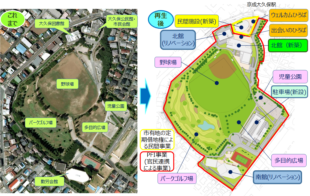 ・具体的には、京成大久保駅周辺1km圏内にある4つの施設(公民館、図書館、児童館等)と、同駅前に立地する3つの同種の施設の機能を統合し、PFI事業により、同駅に隣接する中央公園内に2つの新たな生涯学習施設を再生整備することとした。