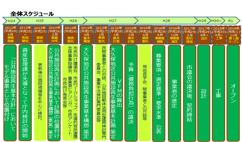 「大久保地区公共施設再生事業」は、「公共施設再生計画」のモデル事業として位置づけており、「公共施設再生計画」の検討段階の平成25年度から、同時並行で検討を進めてきた。
