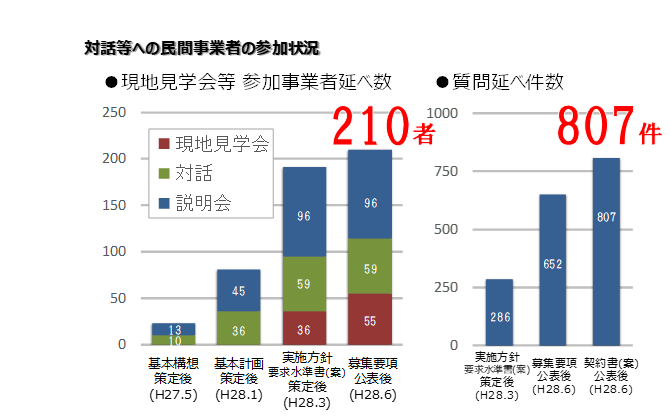 ・事業スキームが複雑であったことから、事業の初期段階から民間事業者との対話を繰り返し、事業の実現可能性を探り、対話等への参加者も多く、複数グループからの提案を期待したが、実際の事業者選定段階では、最終的に1グループのみと提案となってしまった。