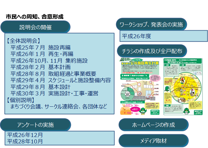 ・事業の実施にあたっては、対象施設が複数の所管課にわたることから、関係各課による検討会議を設置するとともに、施設の統廃合を伴うことから、市民との合意形成に配慮した。