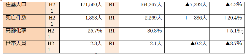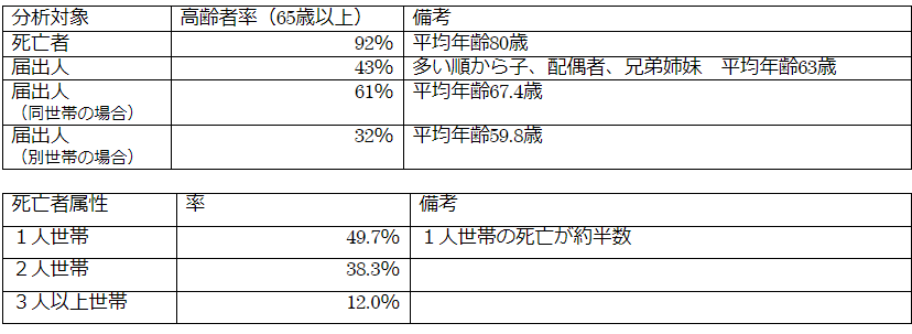 少子高齢化社会の到来により人口減少が進む中、死亡件数は増加している状況である。また、社会構造の変化により、核家族化も進んでいることが伺える。このことから、死亡の手続きにおいては、「2人世帯の場合 ⇒ 残った高齢者が手続者」、「1人世帯の場合 ⇒ 他世帯の親族(子等)が手続者」であることが多く、故人の状況を正確に把握できていない者が手続者となるケースが増えていると考える。