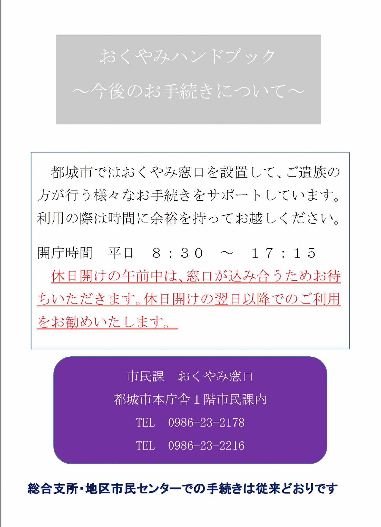 ・当市は、様々な取組を推進した結果、マイナンバーカード普及率市区別日本一となり、令和2年5月時点で、36%以上の市民がカードを取得している。この都城市の強みとも言えるマイナンバーカードを利用したおくやみ窓口は全国初である。なお、おくやみ窓口を、エクセル活用型ではなく、先端技術を活用したシステム活用型としたことで、各課に負担をかけずにおくやみ窓口だけで完結できるようになっている。