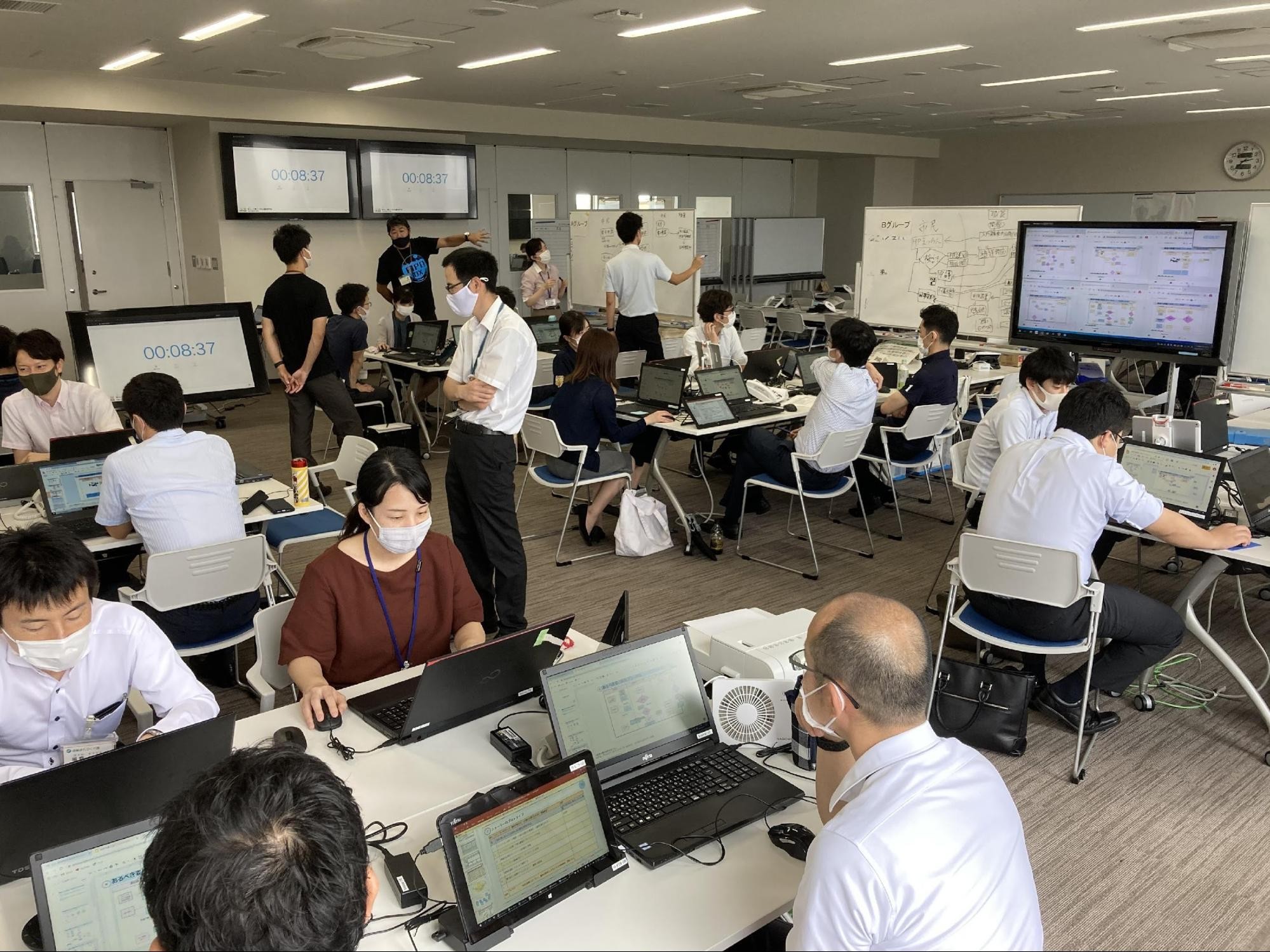 ・定型業務や窓口業務、施設管理など特定の分野にグルーピングすることにより、参加者が各々の職場で抱える共通課題の下、抜群のチームプレイを発揮してスムーズに取組めた。