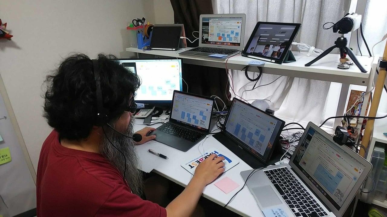 ↑全6チームの作業状況をPC6台を使って確認する講師