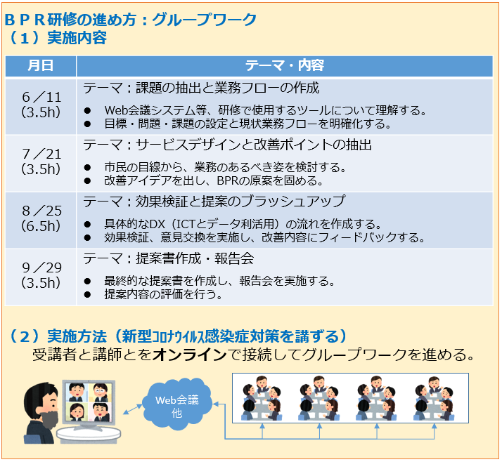 4~5人の全6チームで、グループワーク形式にてBPR研修を実施する。参加者が持ち寄った業務課題を対象に、サービスデザインの手法を用いた課題分析やあるべき姿の業務フロー作成、ペーパープロトタイプ作成、定量・定性評価指標の作成等を行う。各チーム、Web会議アプリ(Zoom)や共同編集ツール(Googleスライド)を活用してオンラインにて実施する。
