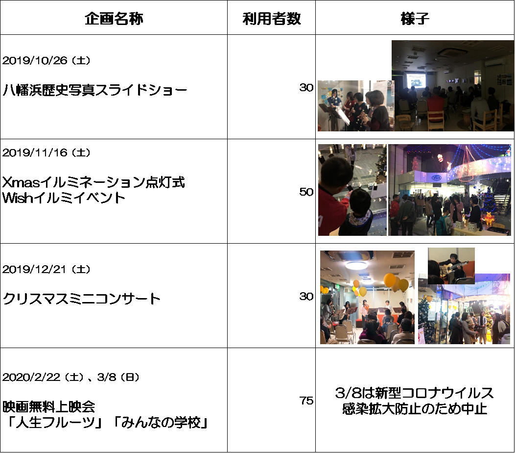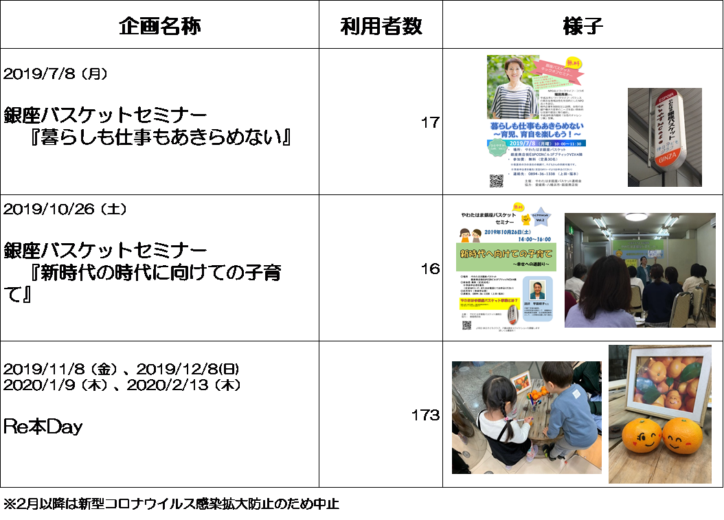 令和元年6月に開始し、新型コロナウイルスの影響を受けて各種企画が中止になる3月までの9ヶ月の間に、全ての企画を併せて延べ700人近くの方がやわたはま銀座バスケットに来場した。クラブ利用児童の保護者や、協力してくださった地域・企業の方も含めると、更に多くの方が事業に関わって足を運んでくれている。