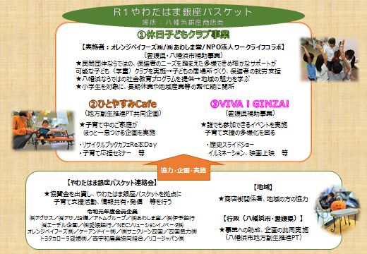 ・休日子どもクラブを商店街の空き店舗を活用して設置することが決定→施設オーナー・地域の協力により、施設を子育て支援拠点として活用→「ひとやすみCafe」による子育て支援企画や、「VIVA!GINZA!」による商店街を活用したイベントを実施→すべての事業をまとめて「やわたはま銀座バスケット」事業として展開