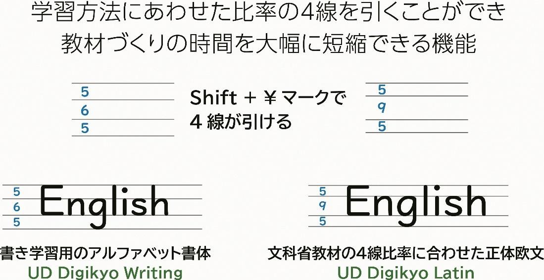 また、このアルファベット書体は、キーボードの「shift」と「¥マーク」で4線が引けるので、教員の教材づくりの時間を短縮でき、教材づくりの質の向上にもつながっている。