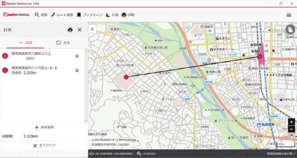 また、2地点間の直線距離はもちろん、自治体が推奨する道順といった任意のルート計算も、最大10カ所の経由地を指定することで可能。このように多様なルート検索ができる上、地図データを自社で整備制作しているため著作権を保有し、ライセンスには、地図・ルート印刷の社内利用許諾が含まれていることも大きな強みだ。