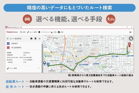 「これらの課題を解決するために、自治体や法人向けにWindowsのPC用地図ソフト『MapFan Desktop(以下、マップファンデスクトップ)』を開発しました」と渡辺さん。インクリメントPは、音響や映像分野で知られる大手パイオニアの出資で平成6年に創業、以来デジタル地図ソフトを展開している。平成13年にリリースしたWindowsPC用地図ソフト「MapFan. net 」は「グッドデザイン賞」を受賞した。このソフトをさらに進化させ、令和2年1月にリリースしたのが、マップファン デスクトップだ。「このソフトは、カーナビにも採用される精度の高いデータをもとに適切なルートを算出します。特にマップファン デスクトップには、自動車ルート検索だけでなく徒歩ルート検索の機能も備えています。徒歩ルート検索では、自動車ルートには適さないが歩行者なら通行できる細い道や、一方通行を通るルートを検索できます。この機能を使えば、自動車の通勤手当の申請や交通費の精算だけでなく、距離や時間で交通手段が分かれる徒歩・バス通勤手当の申請、交通費の精算にも利用可能です」。