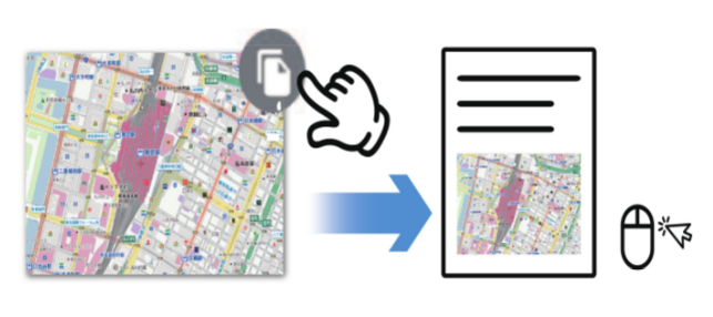 画面に表示されている地図をワンクリックでコピー可能。エクセルやワードなどの申請書類に簡単に地図を貼り付けられる。