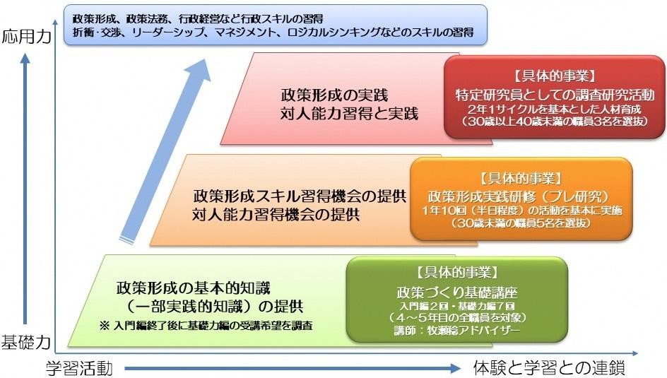 しかし、政策形成能力は短期間の研修や講座を通じて体得できるものではなく、長期間にわたって経験と学習活動を繰り返すことによって体得されるものであるため、どのような仕組みが将来に渡って人材育成の成果をもたらすのか大きな悩みとなっていた。