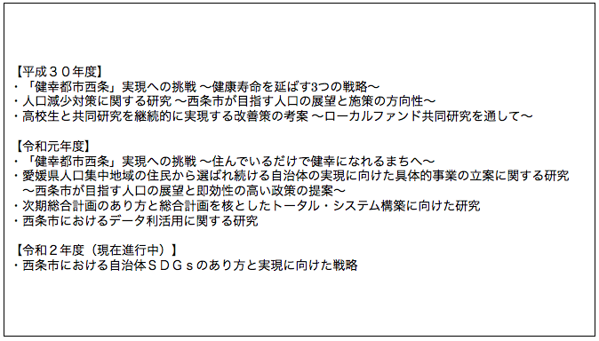 本市では、令和元年度に第2期西条市総合計画後期基本計画(第2期西条市まち・ひと・しごと創生総合戦略)を策定したが、本研究所において人口推計や目標設定をはじめ、第32次地方制度調査会答申に盛り込まれている2040年頃を見据えたバックキャスティング思考からの未来予想を行ったため、当初予算に盛り込んでいた外部コンサルタントへの委託費を執行しなかった。将来的には本研究所に携わった多くの職員が政策形成能力を体得して行政経営に携わることで、専門スキルの組織内蓄積が進展することのみならず、行政コスト削減に繋がると期待している。