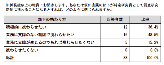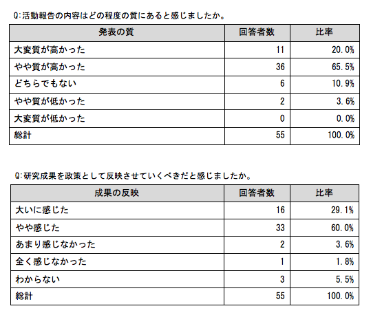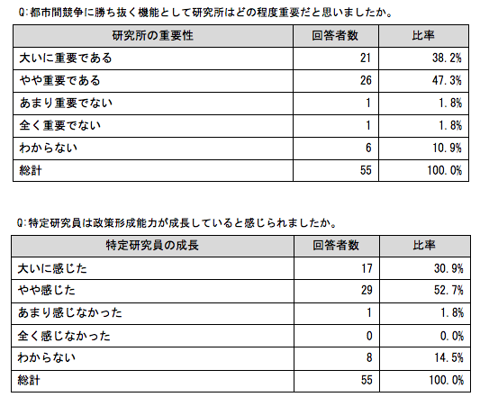 ・前述したとおり、平成30年度末に開催した活動報告会は市職員ほか83名が参加して盛大に開催した。参加者を対象に実施したアンケート調査の結果によると、特定研究員の活動が他の職員にとっても刺激となっている様子が伺えた。詳細は以下のとおりである。