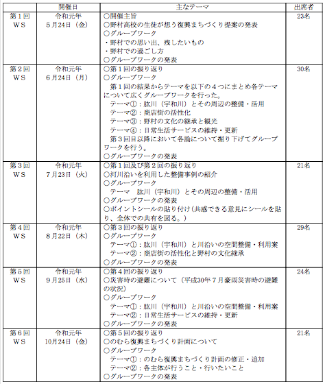 その計画の中で、野村地区の復興方針として「市民、行政、学識者等との協働(総働)による未来へ飛躍する復興の実現」が掲げ、地域の発展につながる復興まちづくりのあり方について、住民と行政、大学等が共にアイデアを出し合う場(ワークショップ)を設け、野村地区の将来像を描いていくことを位置付けている。