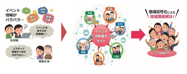 イベントは、人の「行動」を生む、地域活性化に欠かせない要素であるが、一方で情報が一元化されておらず、例えば都城市のイベントを知りたいときには、「都城市+イベント」と検索し、検索結果の上位サイトから順に見比べるといった手間があった。