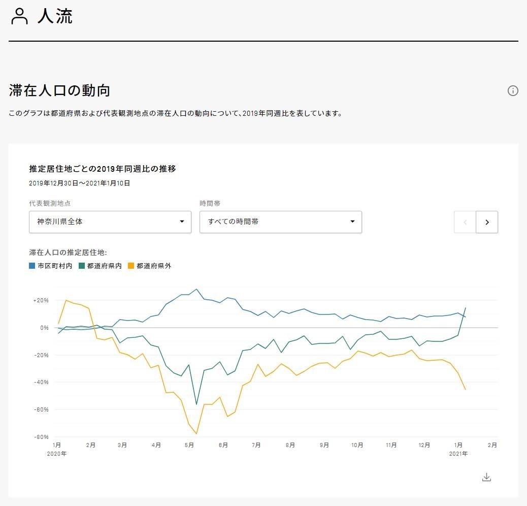 2021年3月時点では、人流、消費、飲食、宿泊、イベント、興味・関心、雇用、企業財務の8カテゴリーを持ち、それぞれ都道府県ごとや時間帯ごとのデータをコロナ前の2019年比でグラフ化しています(消費のみ前年比)。