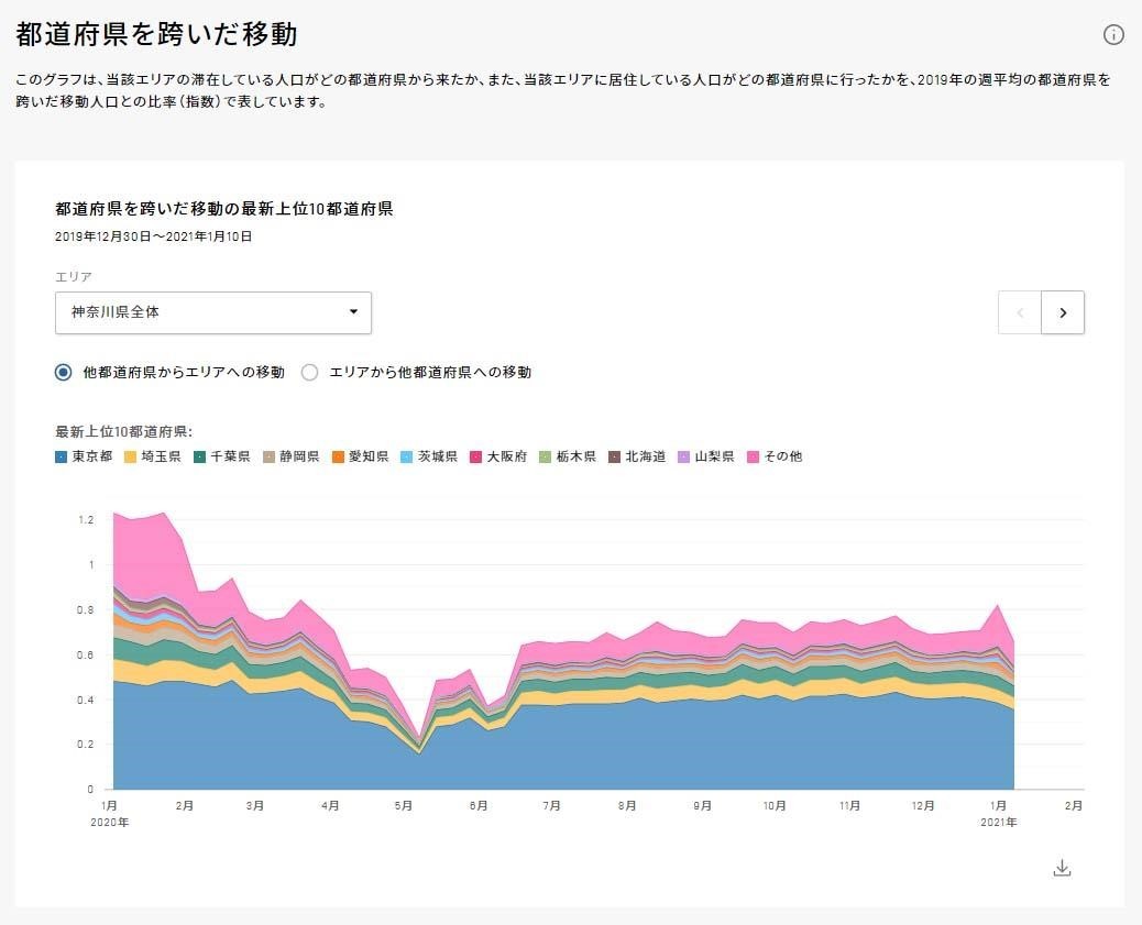 V-RESASでは、都道府県を跨いで移動している人数の推移が見られるようになっており、トップ10も表示されます。その上位にある地域の人びとが、自分たちの地域経済にとってどの程度重要なのかを検証し、動きを回復させるのか、させないのかという判断をする材料にすることができます。
