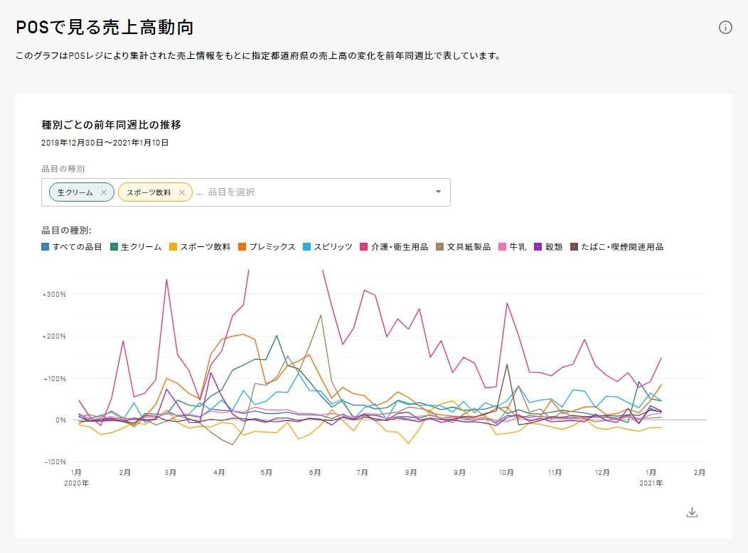 この推移を見ることで、たとえばスポーツ飲料の消費が減ったのは、巣ごもり生活で運動する機会が減ったことが影響していると紐付けることができ、生クリームがホットケーキミックスと連動して上昇しているのは、お菓子づくりに使う人が増えたという推測もできます。